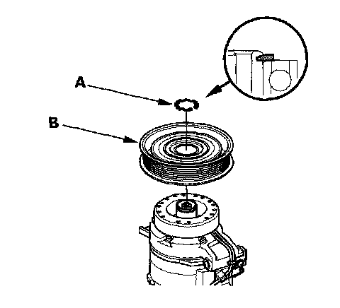 3. If you are replacing the field coil, remove the snap ring (A) with snap ring pliers, then remove the pulley (B). Be careful not to damage the pulley or the A/C compressor.