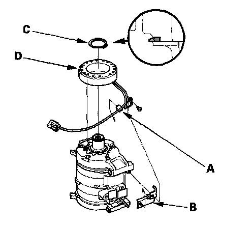 4. Remove the screw, the wire harness clip (A), and the holder (B). Remove the snap ring (C) with snap ring pliers, then remove the field coil (D). Be careful not to damage the field coil or the A/C compressor.