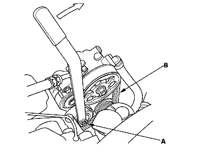 1. Move the auto-tensioner (A) using the belt tension release tool to relieve tension from the drive belt (B), and remove the drive belt.