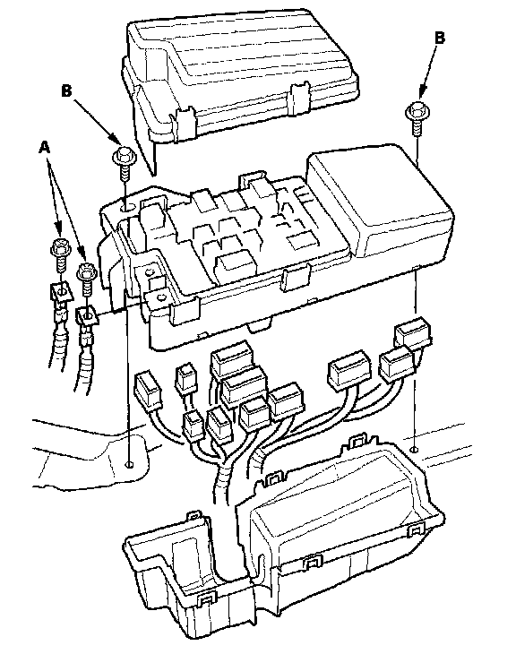 6. Remove the two mounting bolts (B) from the under-hood fuse/relay box.