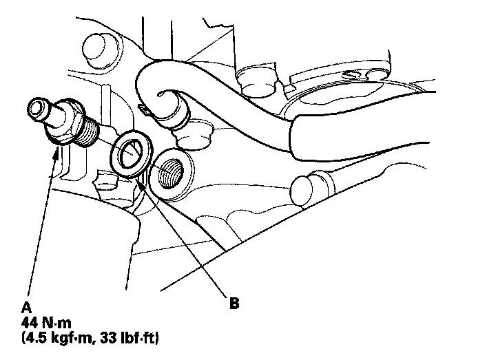 Install the parts in the reverse order of removal with a new washer (B).