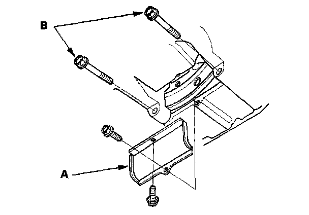 5. Remove the torque converter cover (A) and the two bolts (B) securing the transmission.