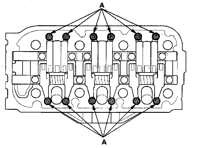 - 2 When removing the rocker arm assembly, do not remove the rocker shaft mounting bolts. The bolts will keep the springs and the rocker arms on the shafts.