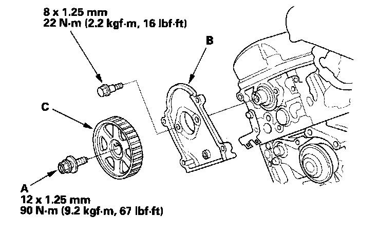 11. Apply new engine oil to the threads of the camshaft pulley mounting bolt (A). Install the back cover (B), then install the camshaft pulley (C).