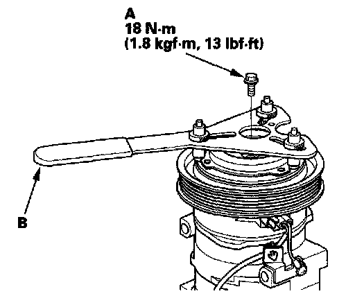 1. Remove the center bolt (A) while holding the pressure plate with a commercially available A/C clutch holder (B).