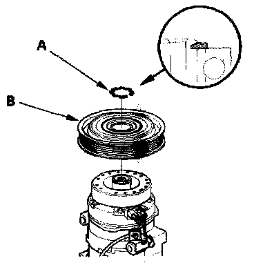 3. If you are replacing the field coil, remove the snap ring (A) with snap ring pliers, then remove the pulley (B). Be careful not to damage the pulley or the A/C compressor.