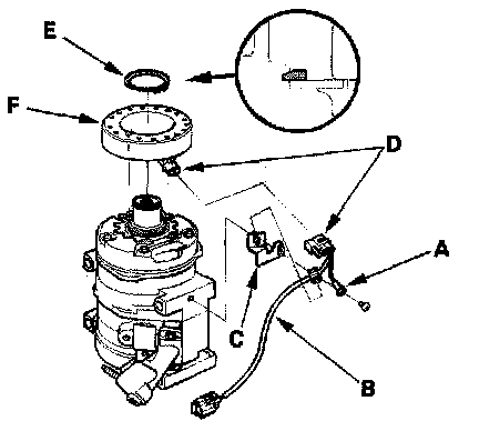 4. Remove the screw from the field coil ground terminal (A), then remove the wire harness (B) and the bracket (C). Disconnect the field coil connector (D). Remove the snap ring (E) with snap ring pliers, then remove the field coil (F). Be careful not to damage the field coil or the A/C compressor.