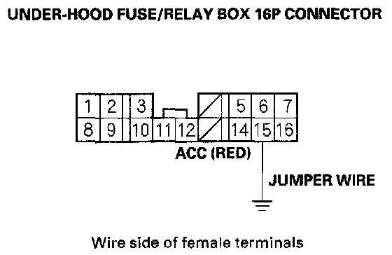 9. Momentarily connect under-hood fuse/relay box 16P connector terminal No. 15 to body ground with a jumper wire several times.