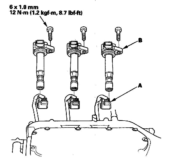 2. Disconnect the ignition coil connectors (A), then remove the front bank ignition coils (B).