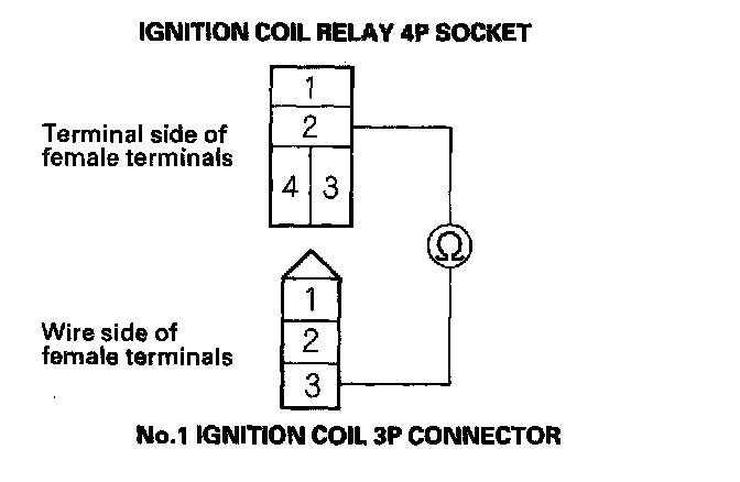 4. Check for continuity between ignition coil relay 4P socket terminal No. 2 and the No. 1 ignition coil 3P connector terminal No. 3.
