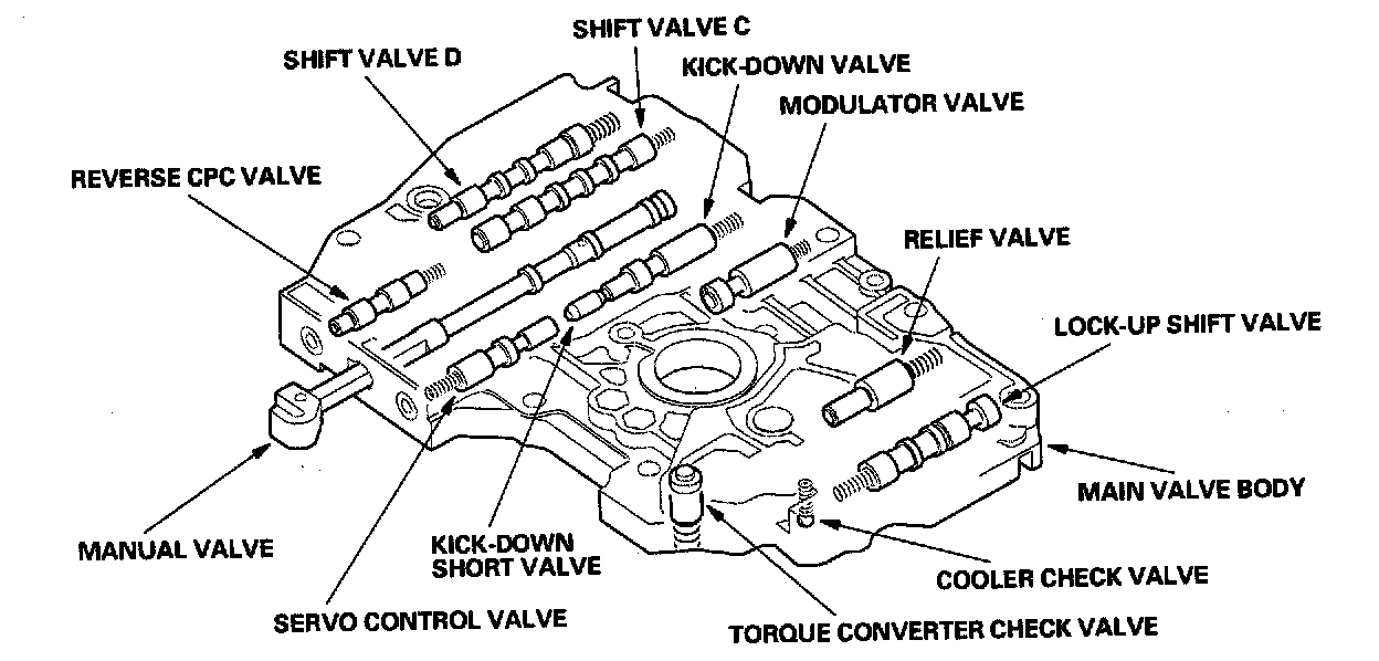 The main valve body contains the manual valve, the modulator valve, the shift valve C, the shift valve D, the servo control valve, the cooler check valve, the torque converter check valve, the reverse CPC valve, the lock-up shift valve, the relief valve, the kick-down valve, the kick-down short valve, and the ATF pump gears. The primary function of the main valve body is to switch fluid pressure on and off and to control hydraulic pressure going to the hydraulic control system.
