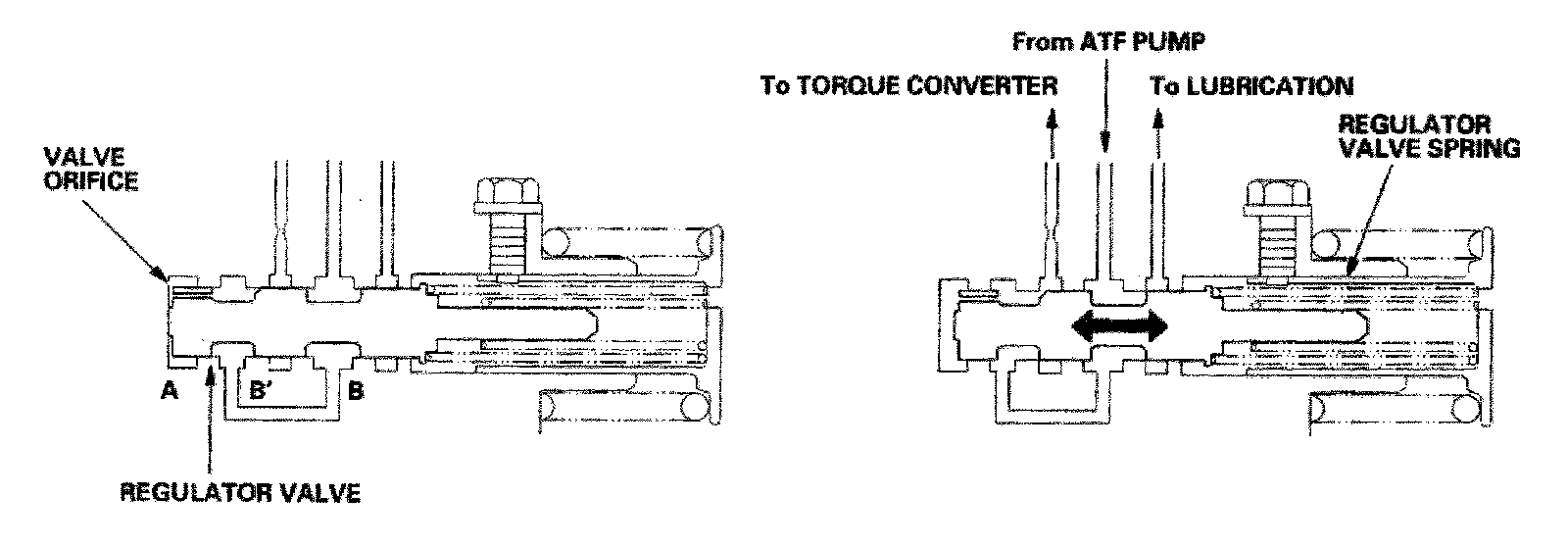The regulator valve maintains constant hydraulic pressure from the ATF pump to the hydraulic control system, while also furnishing fluid to the lubricating system and torque converter. Fluid from the ATF pump flows through B and B'. Fluid entering from B flows through the valve orifice to the A cavity. This pressure of the A cavity pushes the regulator valve to the spring side, and this movement of the regulator valve uncovers the fluid port to the torque converter and the relief valve. The fluid flows out to the torque converter and the relief valve, and the regulator valve returns under spring force. According to the level of the hydraulic pressure through B, the position of the regulator valve changes, and the amount of fluid from B' through the torque converter changes. This operation is continued, maintaining the line pressure.