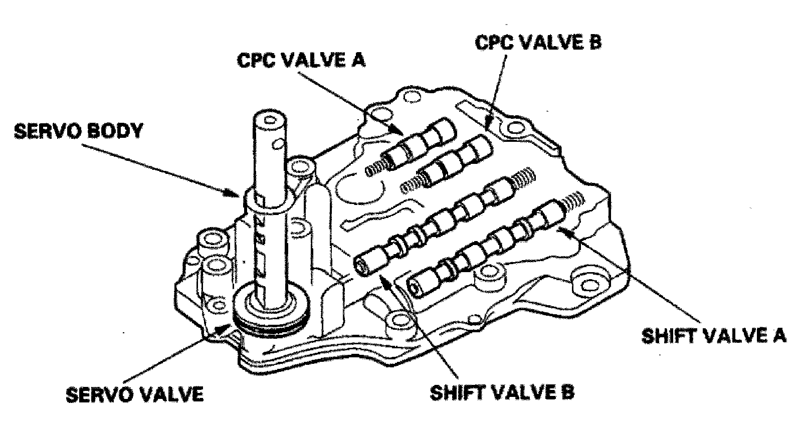 The servo body is on the main valve body. It contains the servo valve, shift valve A, shift valve B, and CPC valves A
