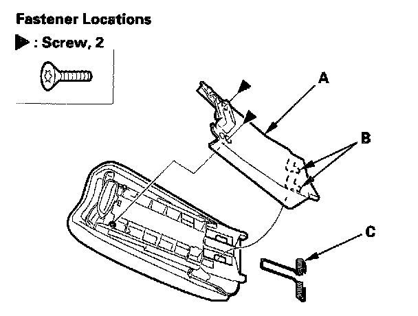 2. Using a T15 Torx bit, remove the screws. Slide the armrest liner (A) downward to release the hooks (B), then remove the armrest liner and armrest spring (C).