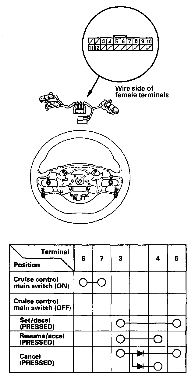 - If there is continuity, and it matches the table, but switch failure occurred on the cruise control input test, check and repair the wire harness on the switch circuit.