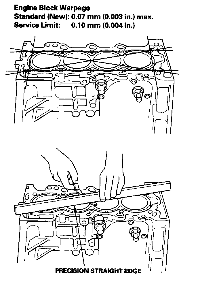 6. Check the top of the engine block for warpage. Measure along the edges and across the center as shown.