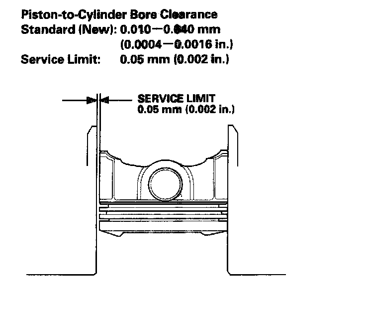 7. Calculate the difference between the cylinder bore diameter and the piston diameter. If the clearance is near or exceeds the service limit, inspect the piston and the engine block for excessive wear.