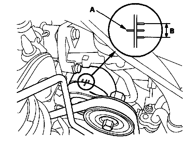 2. Check that the auto-tensioner indicator (A) is within the standard range (B) as shown. If it is out of the standard range, replace the drive belt.