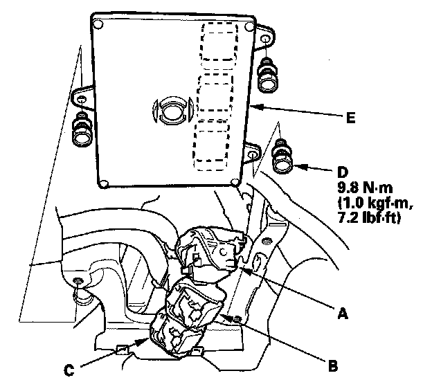 10. Remove the bolts (D), then remove the PCM (E).