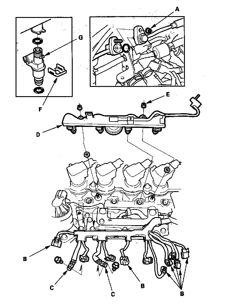 7. Disconnect the hoses from the fuel rail (D).