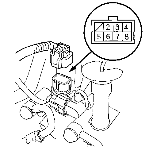 5. Connect a jumper wire from the battery positive terminal to solenoid harness connector terminal No. 3, and connect another jumper wire from the battery negative terminal to terminal No. 7. A clicking sound should be heard.