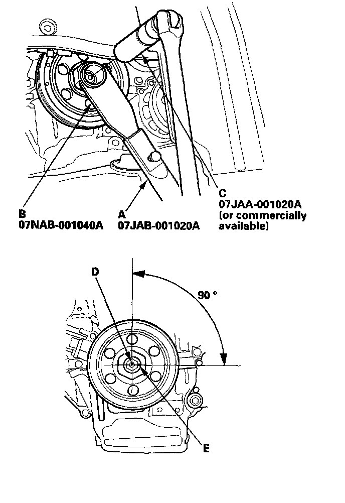 ^ 2 Mark the bolt head (D) and the crankshaft pulley (E) as shown, then tighten the bolt an additional 90° (The mark on the bolt head line up with the mark on the crankshaft pulley).