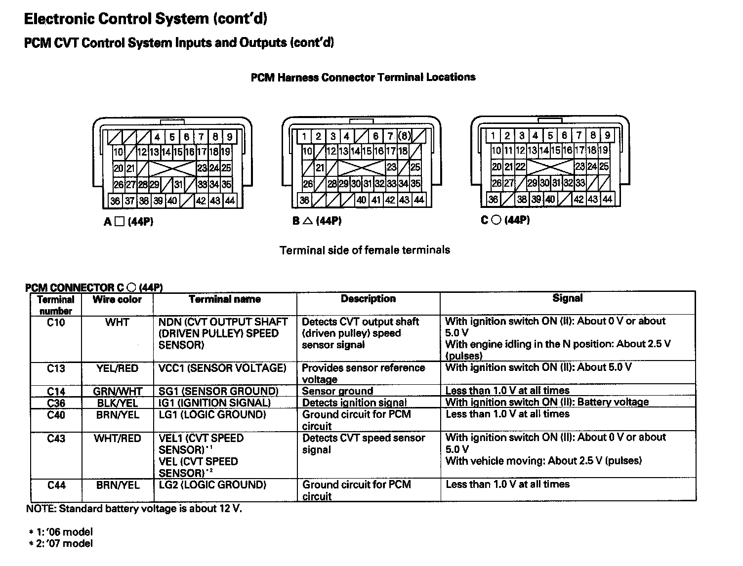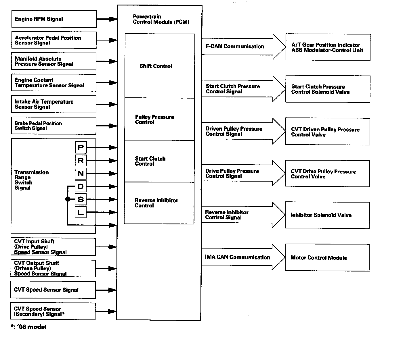 The PCM receives input signals from the sensors, switches, and other control units, processes data, and outputs signals for the engine control system and the CVT control system. The CVT control system includes shift control, pulley pressure control, start clutch pressure control, and reverse inhibitor control. The PCM actuates the pulley control solenoids to control pulley control valves A and B shifting transmission pulley ratios.