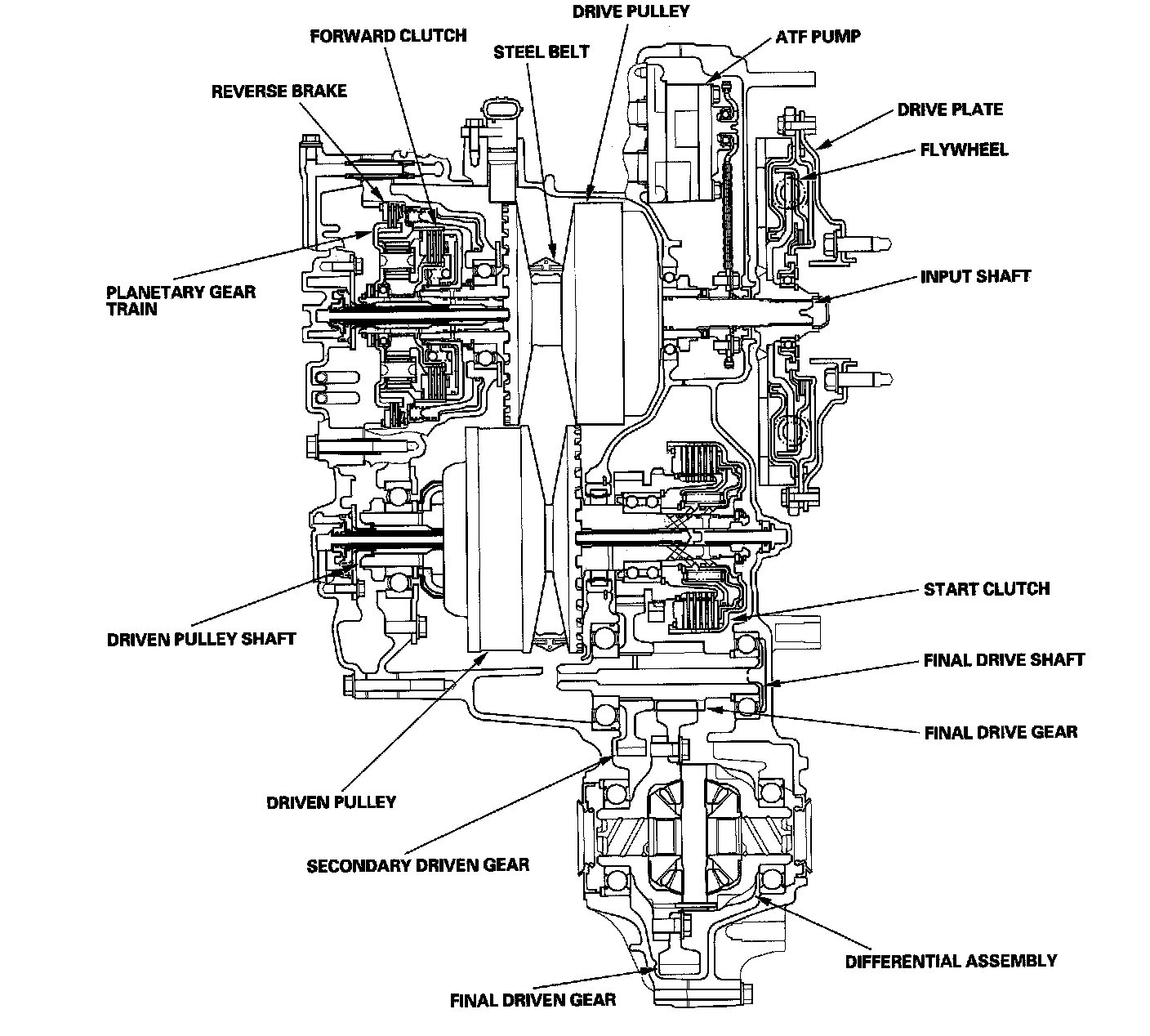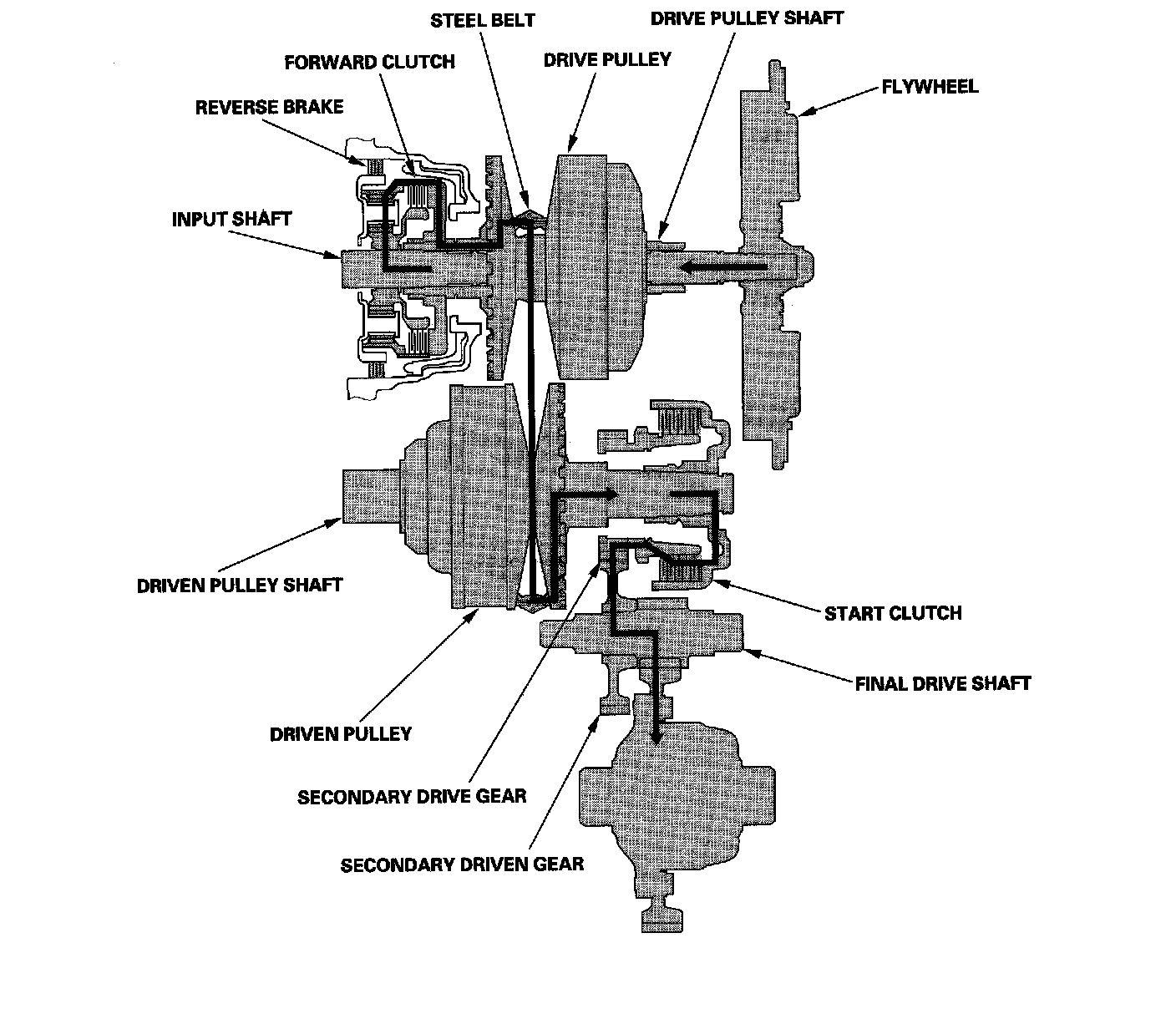 ^ The ring gear drives the drive pulley shaft via the forward clutch drum, and drive pulley shaft drives the driven pulley shaft linked by the steel belt.