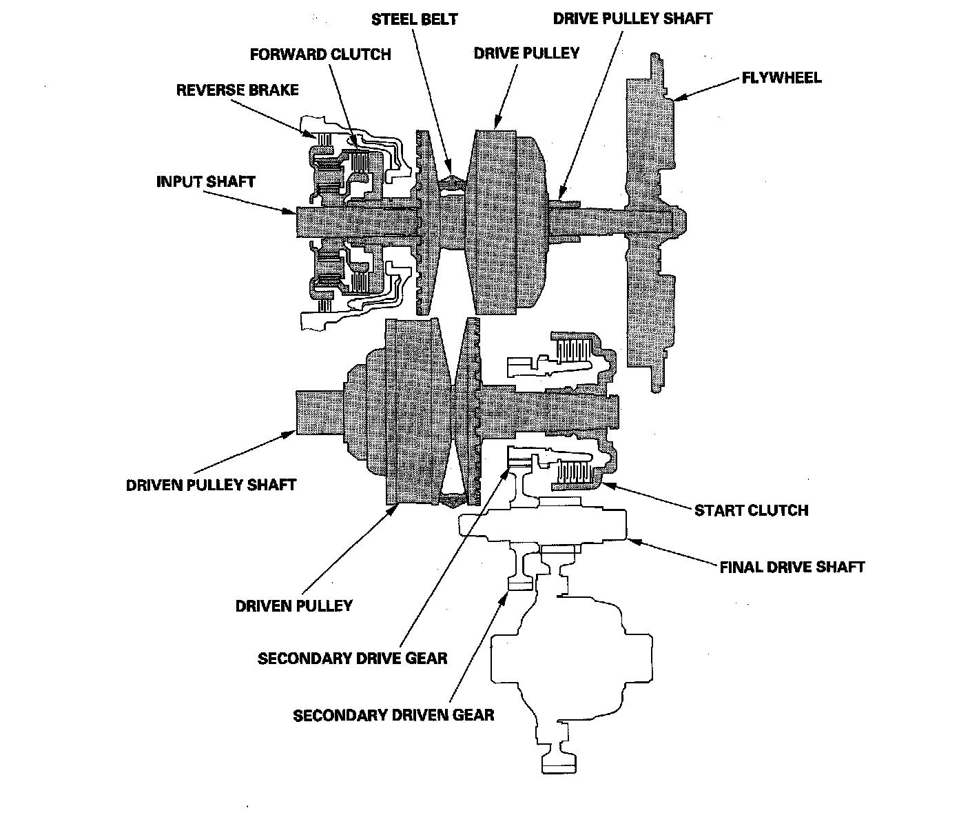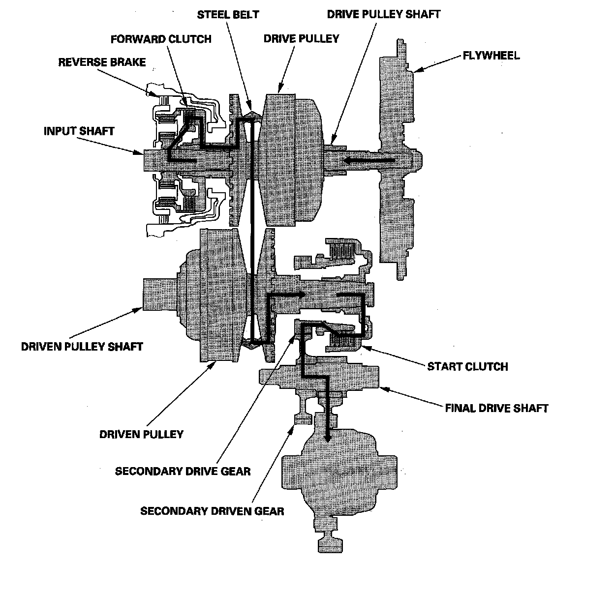 The input shaft includes the sun gear and planetary gears with carrier. The drive pulley shaft includes the drive pulley and forward clutch. The driven pulley shaft includes the driven pulley, start clutch, and the secondary drive gear which is integral with the park gear. The final drive shaft is positioned between the secondary drive gear and the final driven gear. The final drive shaft includes the secondary driven gear and the final drive gear which serves to change the rotation direction, because the drive pulley shaft and driven pulley shaft rotate the same direction. When certain conditions of the planetary gears in the transmission are engaged by the forward clutch and the reverse brake, power is transmitted from the drive pulley shaft to the driven pulley shaft to provide L, S, D, and R positions.