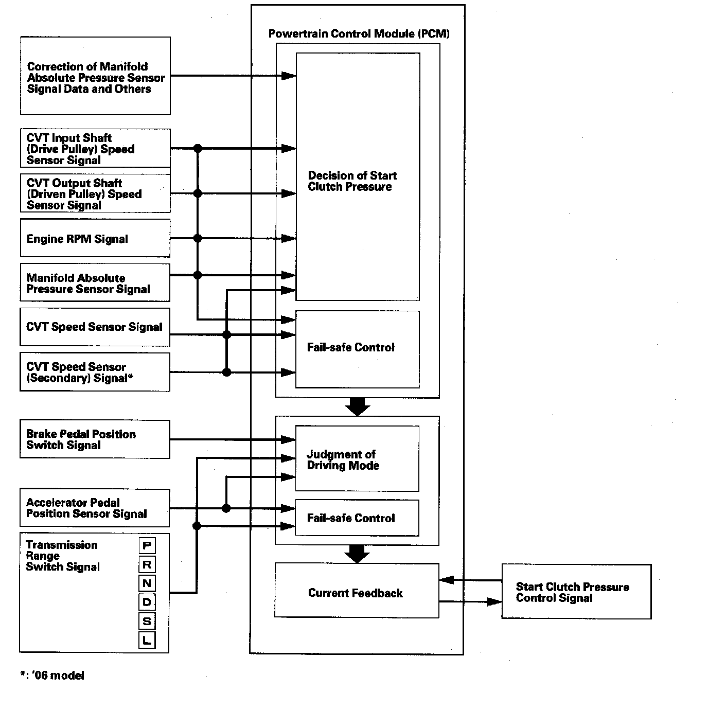 The hydraulic-controlled start clutch controls smooth starting-off and creeping in the D, S, L, and R positions like a torque converter. The PCM inputs signals from the sensors, and switches, and actuates the start clutch pressure control valve to regulate the clutch reducing pressure, and the clutch reducing pressure controls the start clutch.