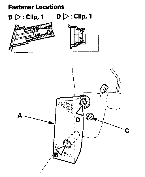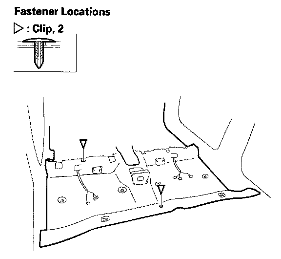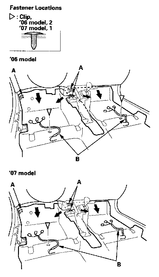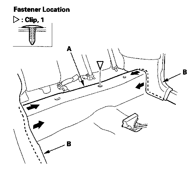 6. Release the clip from the rear portion of the carpet (A). Pull out the edge of the carpet from under both rear side trim panels (B).