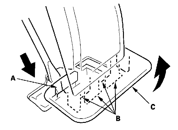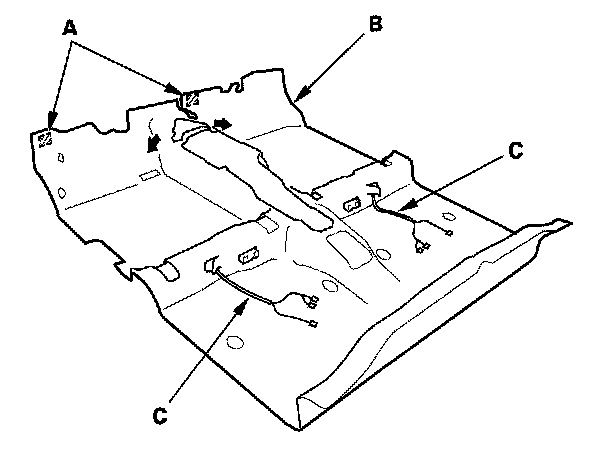 10. Pull the seat harnesses (C) out through the hole in the carpet, then remove the carpet.