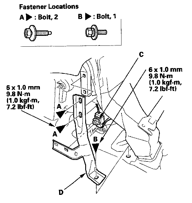 4. Remove the bolts (A, B), and detach the connector clip (C), then remove the center pipe extension (D).
