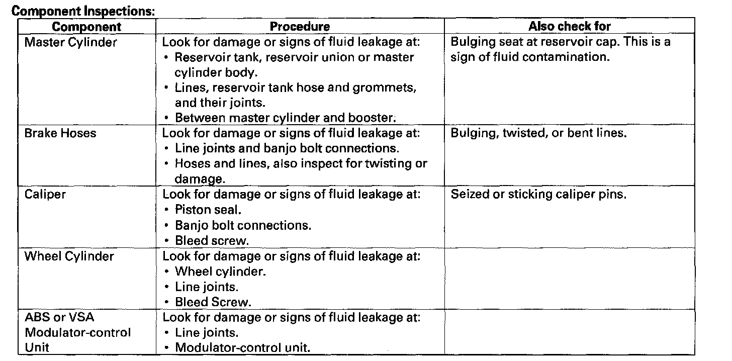 Brake System Inspection and TestInspect the brake system components listed. Repair or replace any parts that are leaking or damaged.