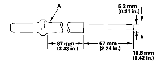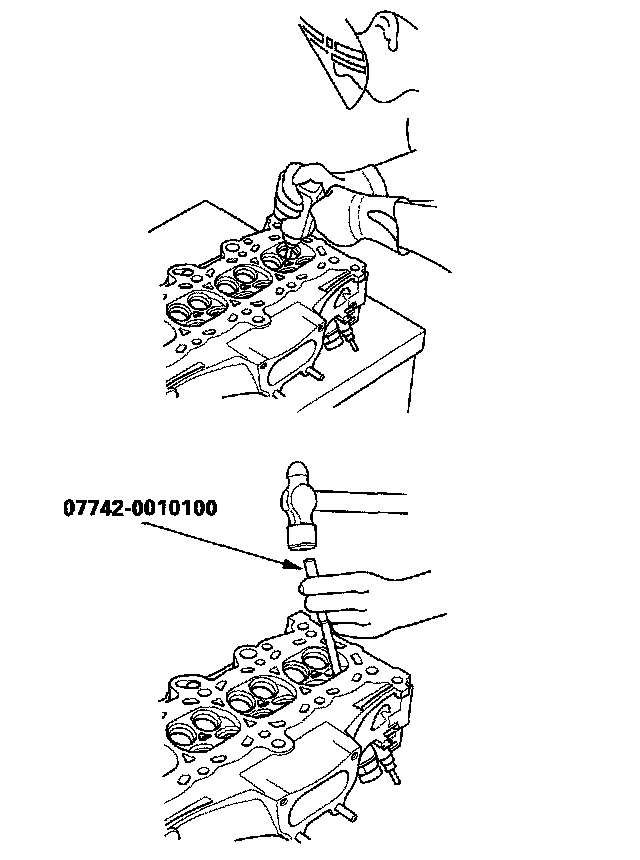 5. Working from the camshaft side, use the driver and an air hammer to drive the guide about 2 mm (0.1 in.) towards the combustion chamber. This will knock off some of the carbon and make removal easier. Hold the air hammer directly in line with the valve guide to prevent damaging the driver, Wear safety goggles or a face shield.
