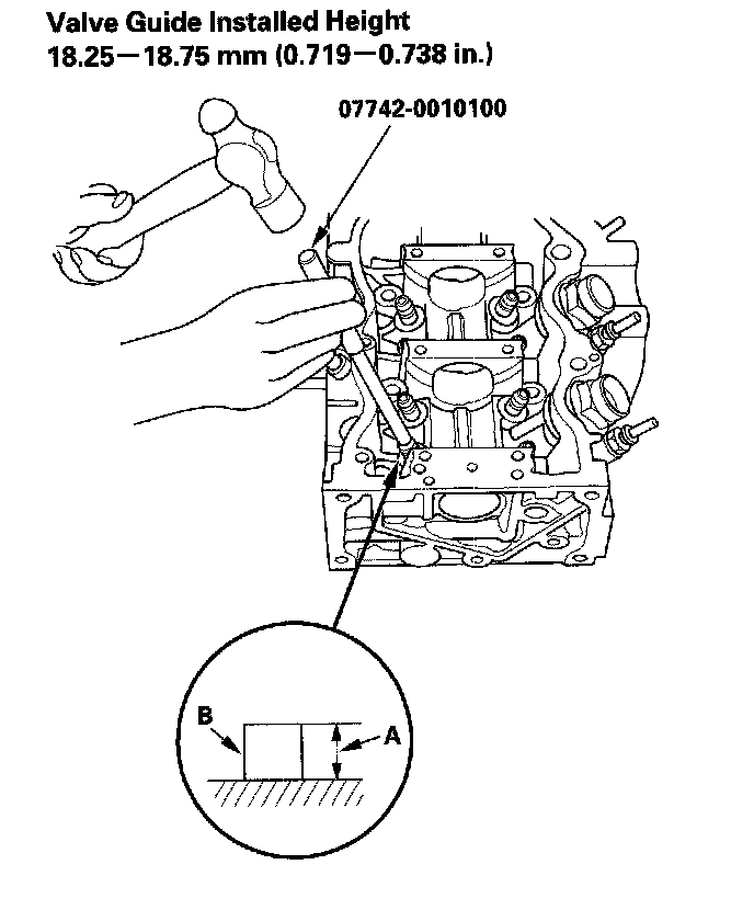 9. Apply a thin coat of new engine oil to the outside of the new valve guide. Install the guide from the camshaft side of the head; use the valve guide driver to drive the guide to the specified installed height (A) of the guide (B). If you have all 16 guides to do, you may have to reheat the head.