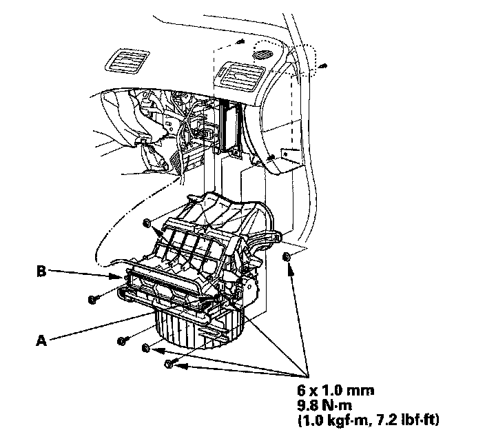 6. Disconnect the connector (A) from the recirculation control motor. Remove the self-tapping screws, the bolt, the mounting nuts, and the blower unit (B).