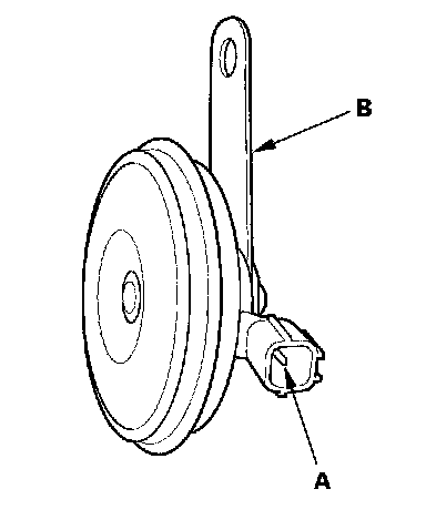 3. Test the horn by connecting battery power to the terminal (A) and grounding the bracket (B). The horn should sound.