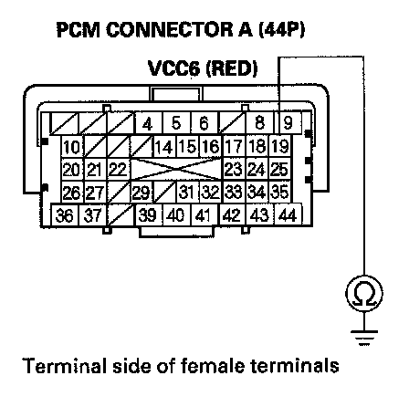 55. Measure voltage between PCM connector terminal A6 and body ground.