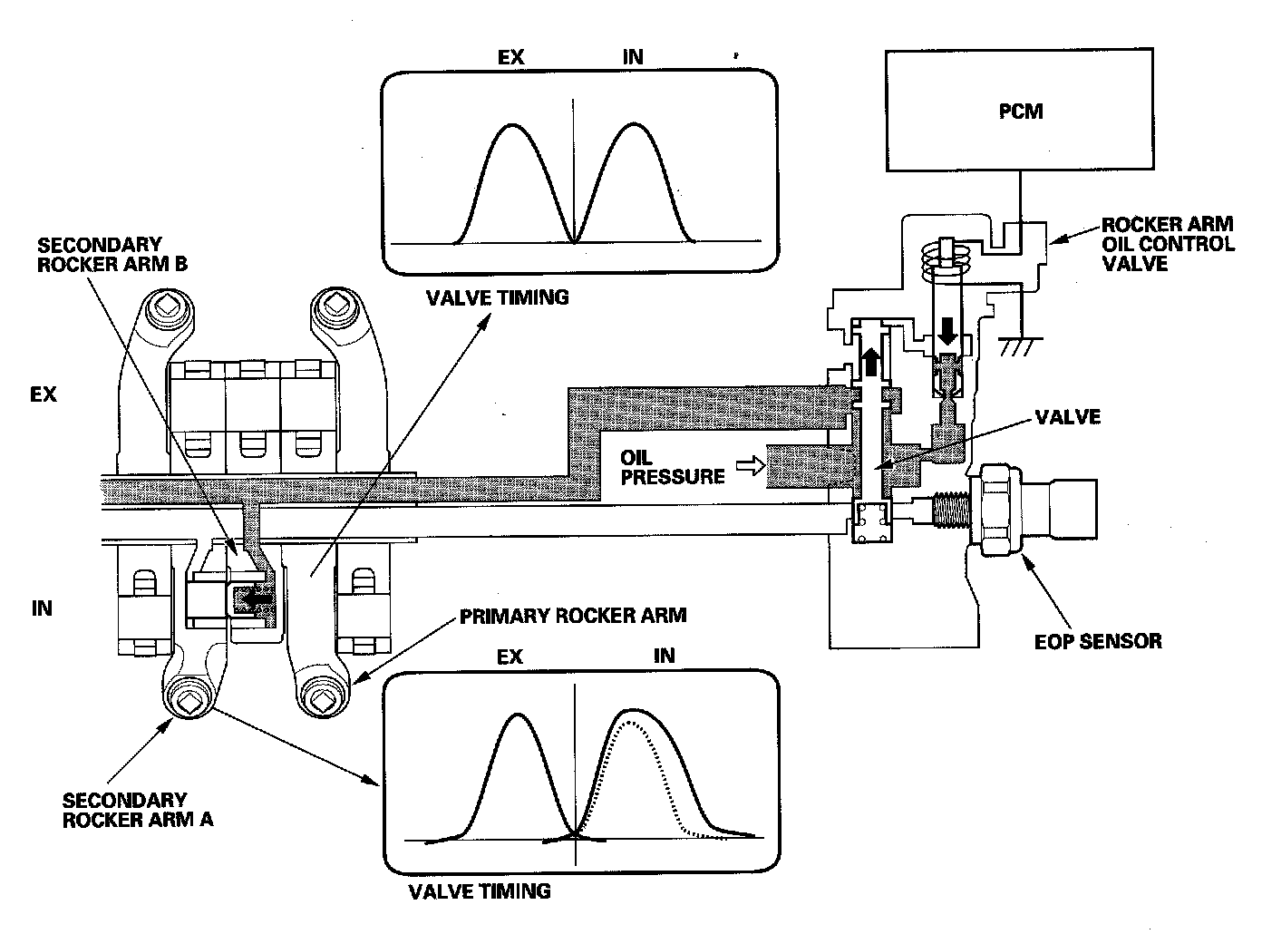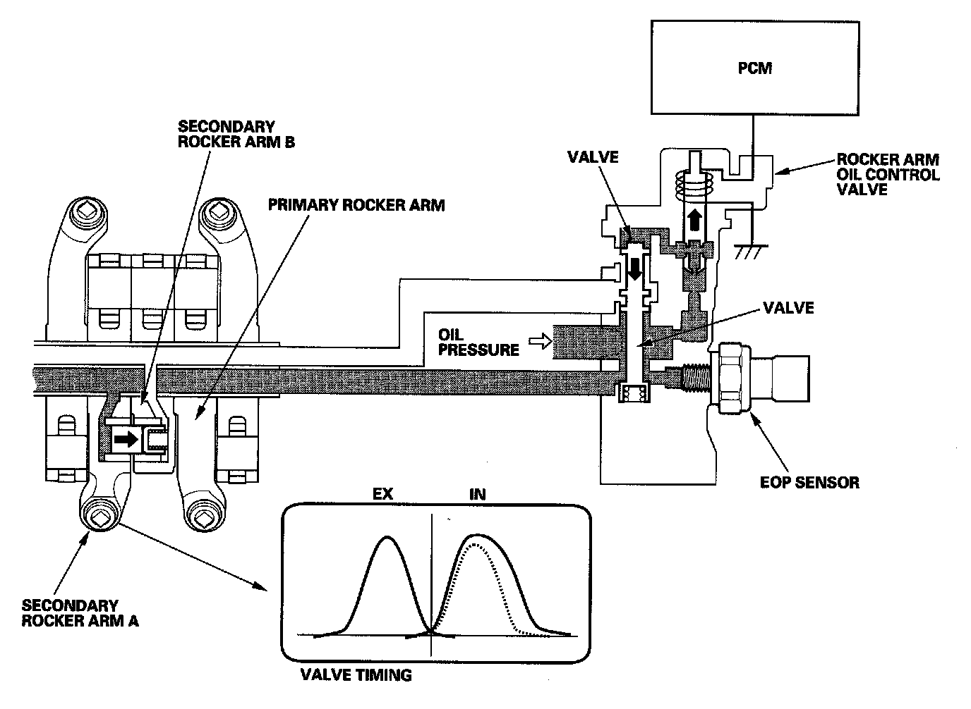This forces the VTEC switching piston into secondary rocker arm A against the return spring and disengages the secondary arm A from secondary arm B to stop valve actuation.