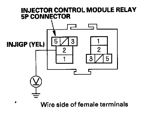 15. Measure voltage between injector control module relay 5P connector terminal No. 2 and body ground.
