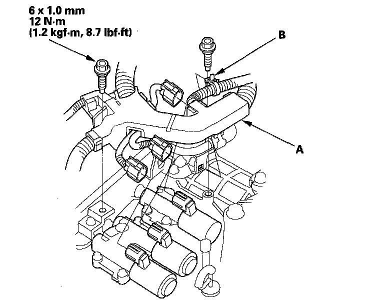 5. Remove the mounting bolts securing the harness cover (A), and remove the harness clamp (B).