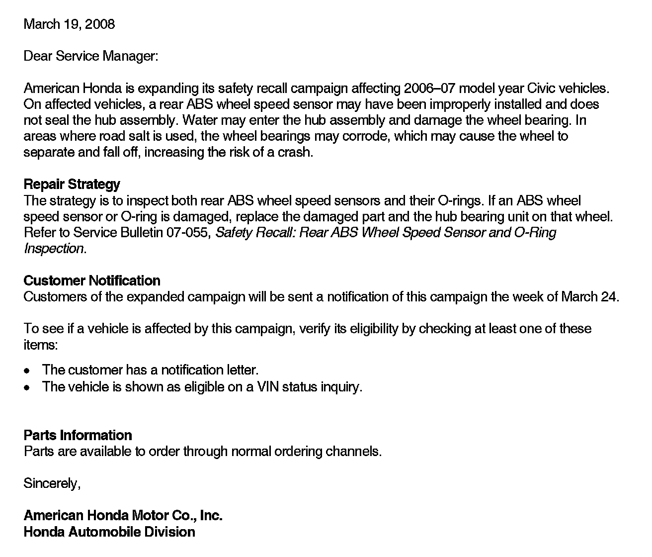 Recall - Rear Wheel Speed Sensor Inspection/Replacement