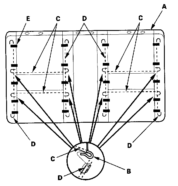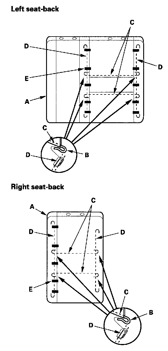 8. Pull back the edge of the seat-back cover (A) all the way around, and release the hooks (B) of the horizontal wires (C) from the vertical wires (D) on the pad, and remove the clips (E), then remove the seat-back cover.