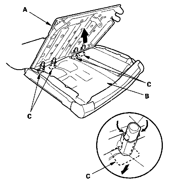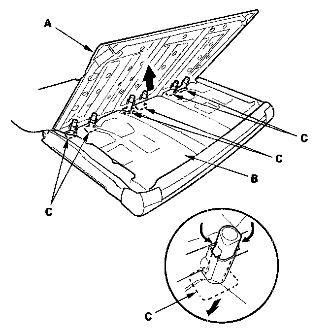 6. Release the lower hook (A), and clips (B, C).