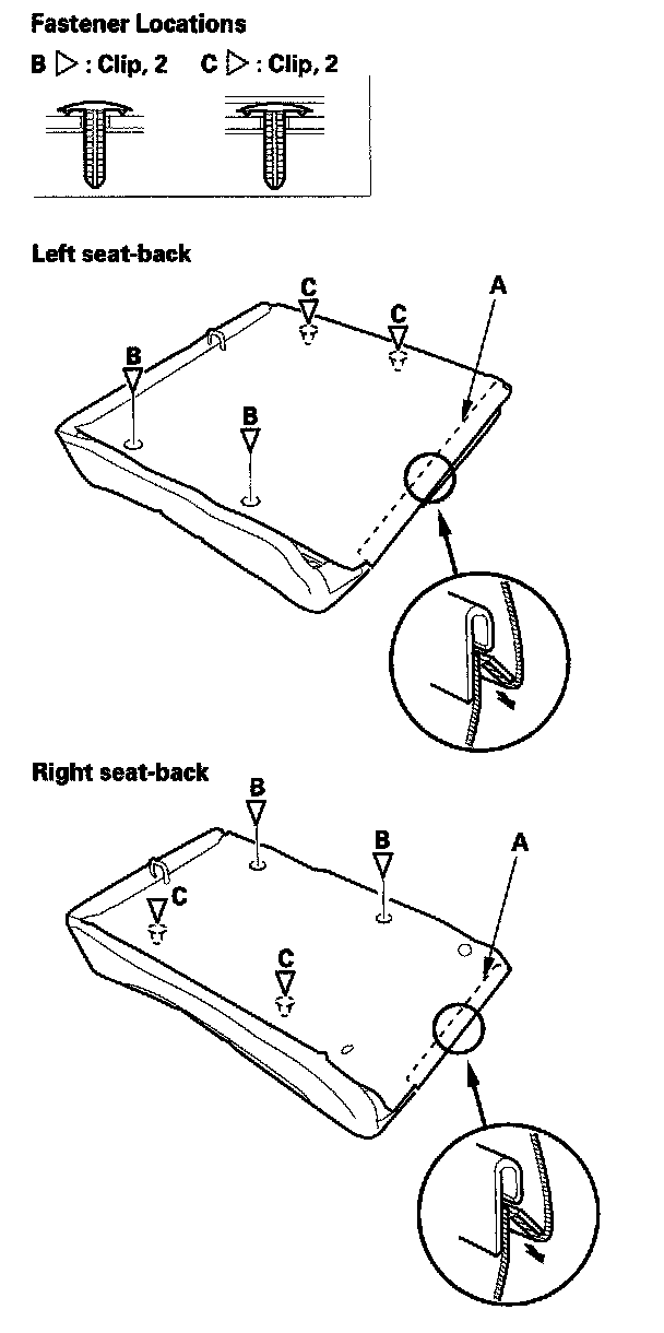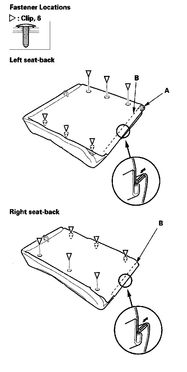 8. Pull back the edge of the seat-back cover (A) all the way around, and release the clips (B), then remove the seat-back cover.