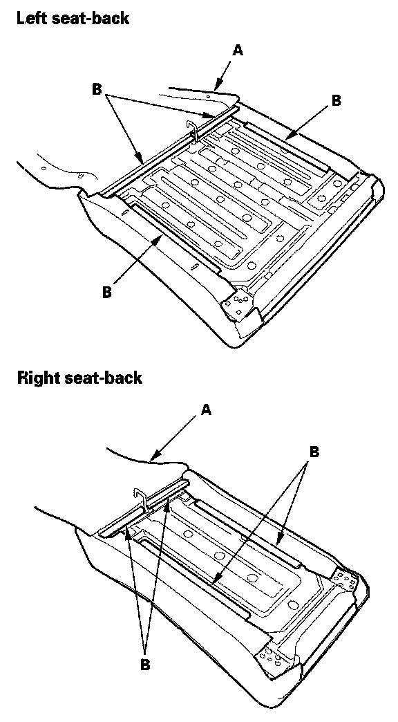 8. Pull out the seat-back frame (A) from the pad (B), then pull out the head restraint guides (C) while pinching the end of the guides, and remove them. The left seat-back is shown; the right seat-back is similar.