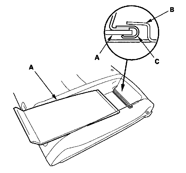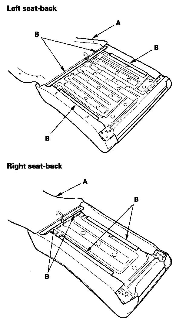 6. Pull out the seat-back frame (A) from the pad (B), then pull out the head restraint guides (C) while pinching the end of the guides, and remove them. The left seat-back is shown; the right seat-back is similar.