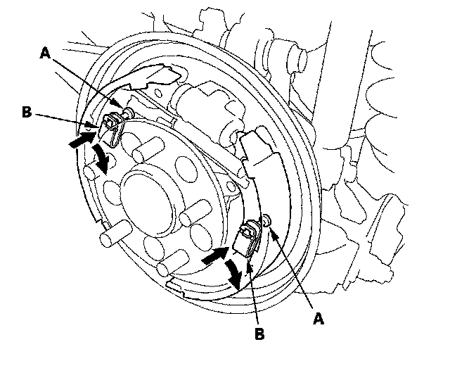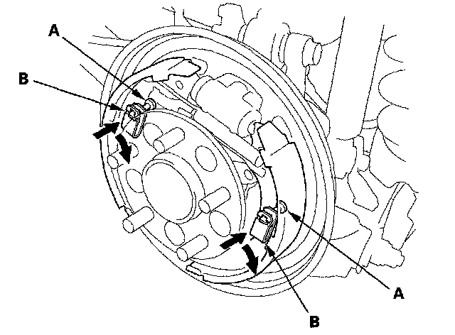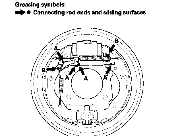 4. Apply a thin coat of rubber grease to the connecting rod ends (A), and the sliding surfaces (B) as shown. Wipe off any excess. Keep grease off the brake linings.