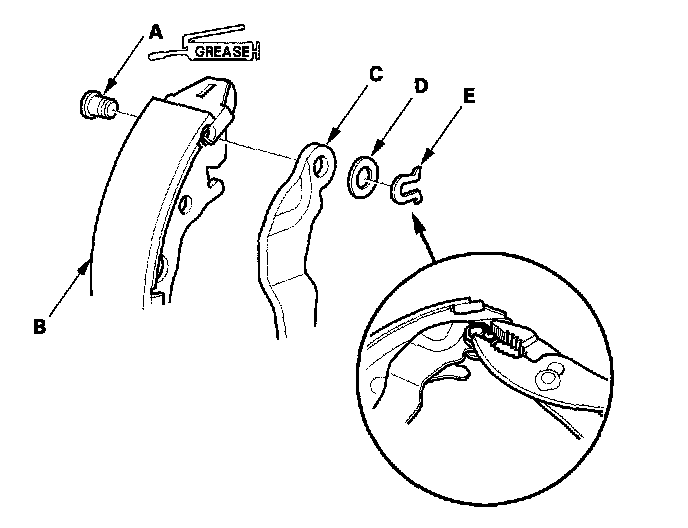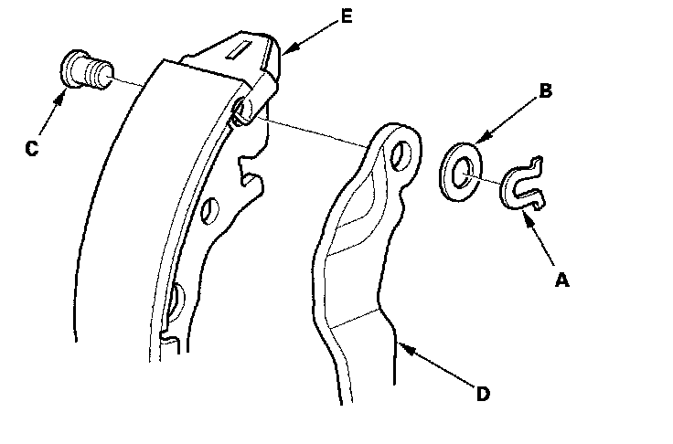8. Remove the U-clip (A), wave washer (B), and pivot pin (C), and separate the parking brake lever (D) from the brake shoe (E).